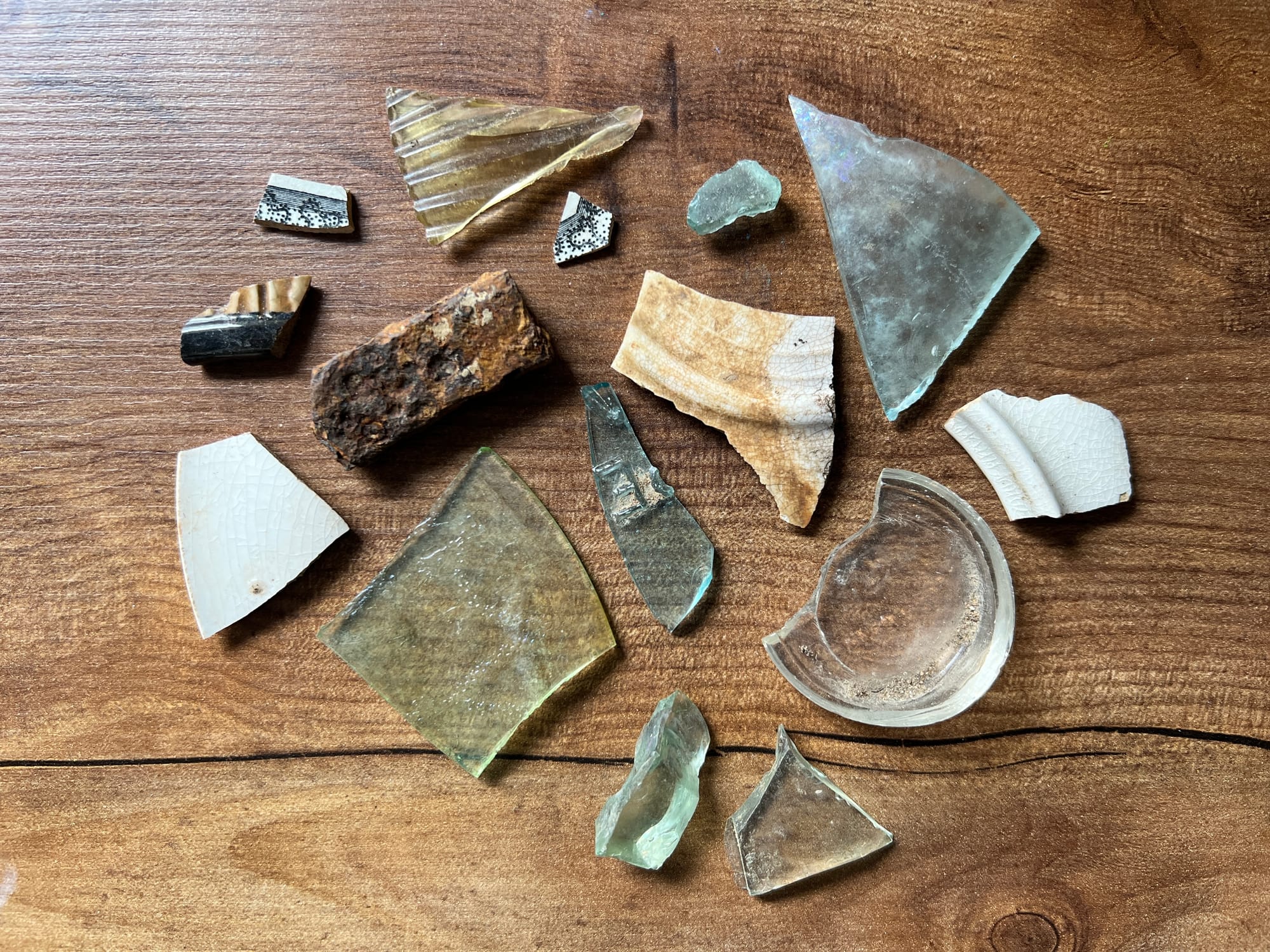The river had revealed many things. A dead tree trunk stood sentinel, tangled into the riverbank of clay and limestone. Its roots lay far above the water line now, gnarled and caked with mud from many seasons past. But, drawing closer, I found tangled among the roots...well, I found treasure. River glass of green and blue and brown and clear iridescence lay atop the roots. Rusted metal curly-cues tangled deep in the root mass. Shards of old plates and cups with delicate designs grew into the wood. A piece of green uranium glass sat abandoned in the river sand.